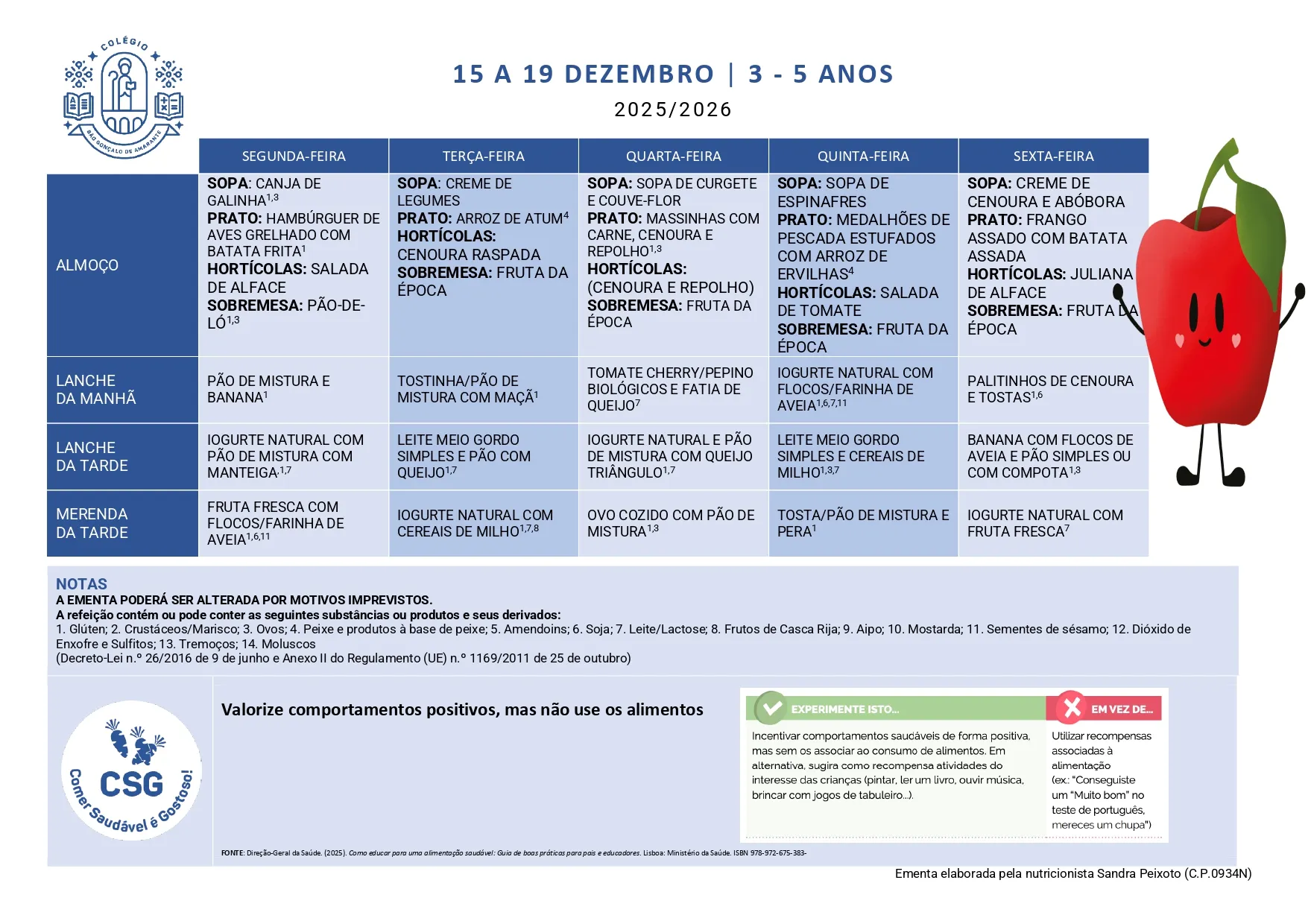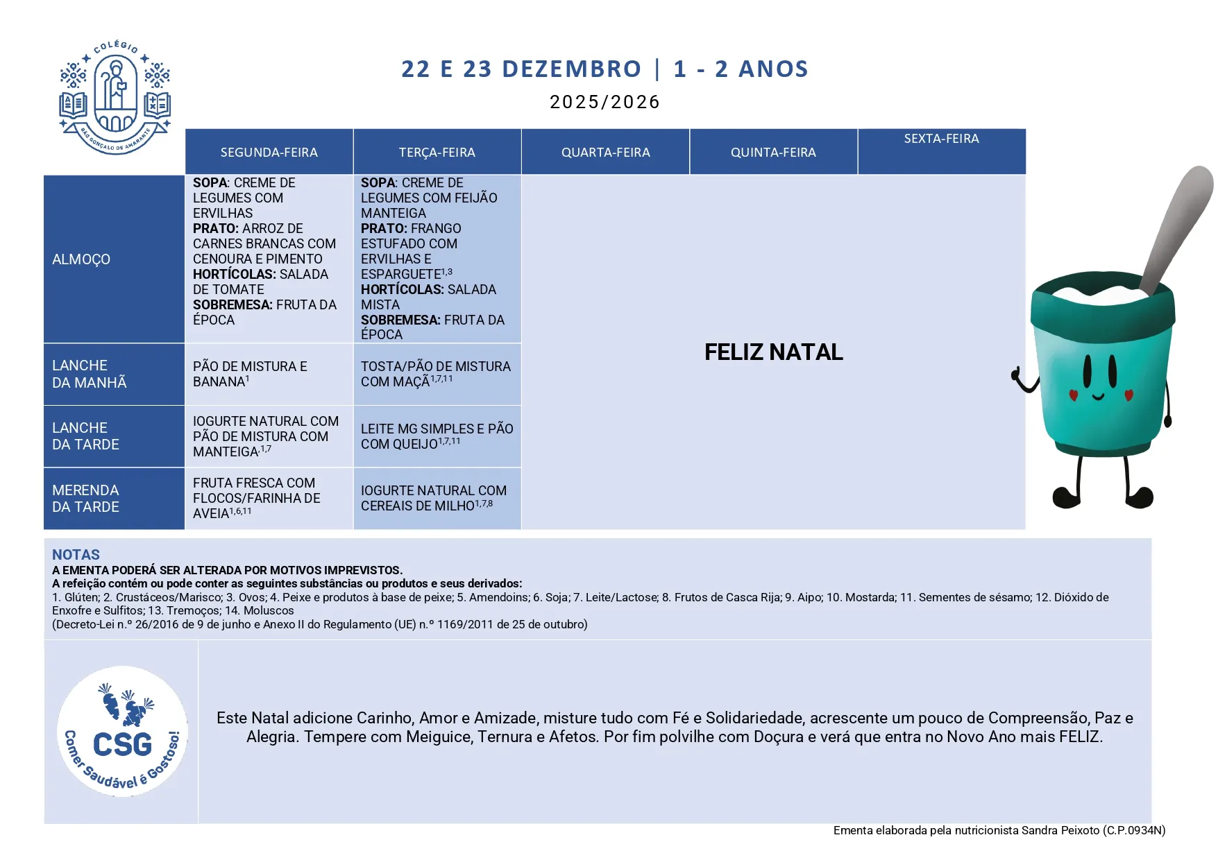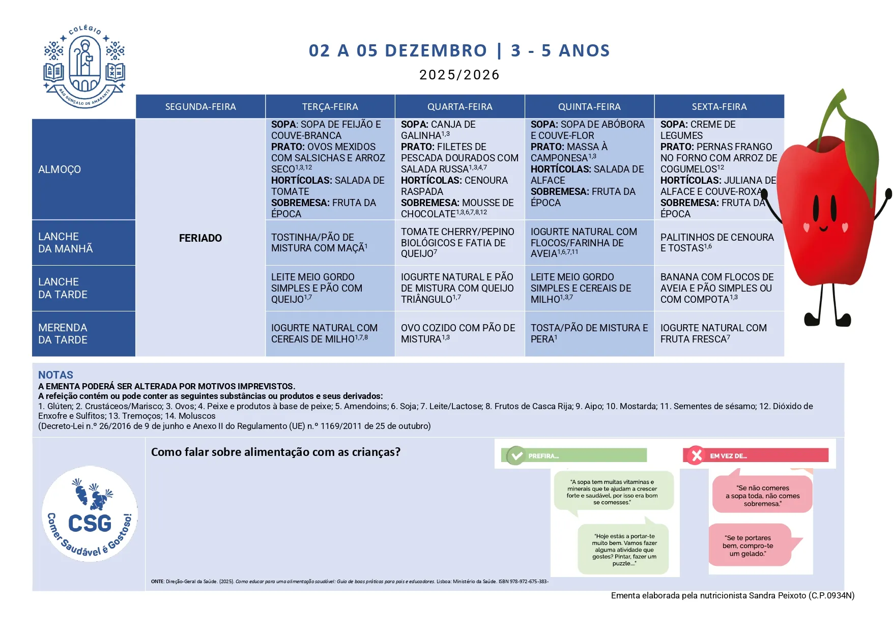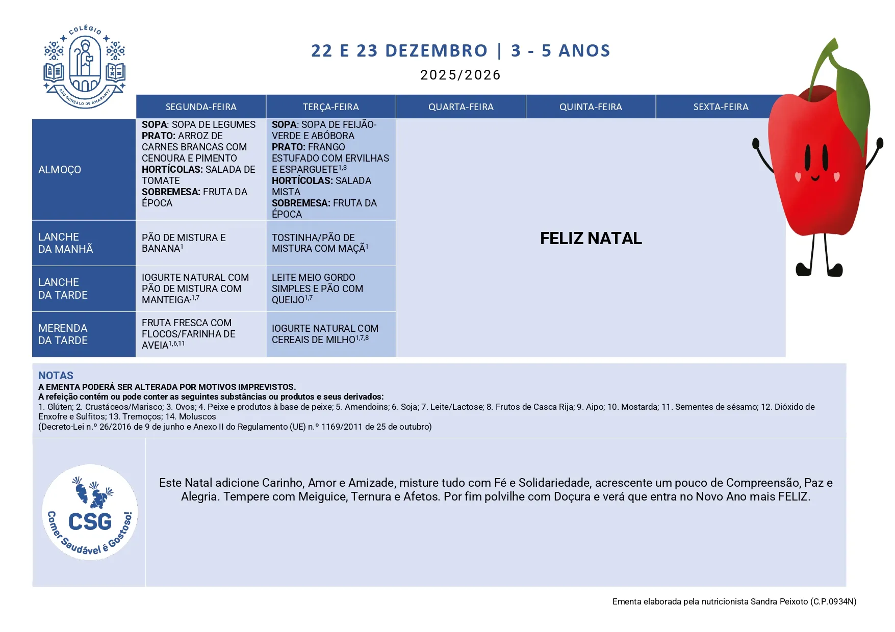 Ementa Home> Ementas> Ementa 09 - 12 dez 2025 Berçário 1 a 2 Anos 3 a 5 Anos Ementa 15 - 19 dez 2025 Berçário 1 a 2 Anos 3 a 5 Anos Ementa 22 e 23 dez 2025 Berçário 1 a 2 Anos 3 a 5 Anos Ementa 28 e 29 dez 2025 Berçário 1 a 2 Anos 3 a 5 Anos