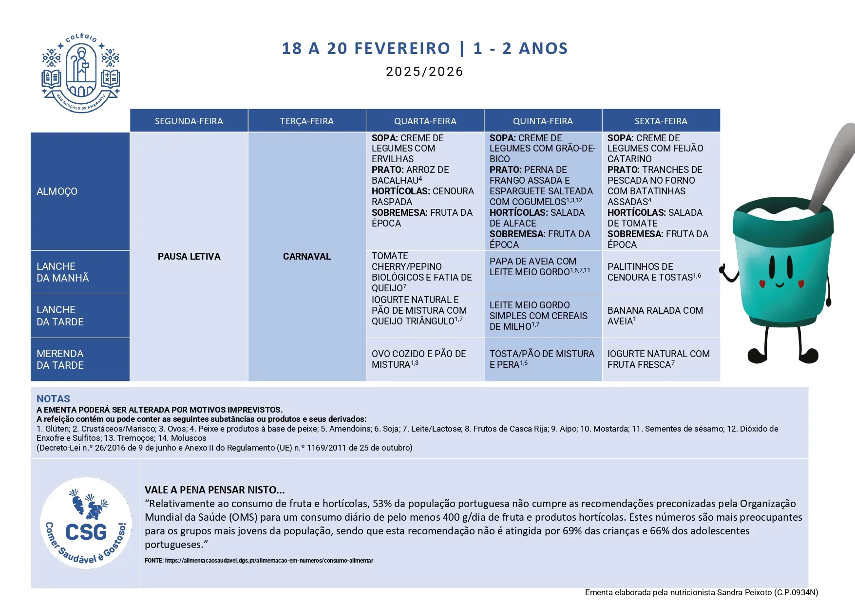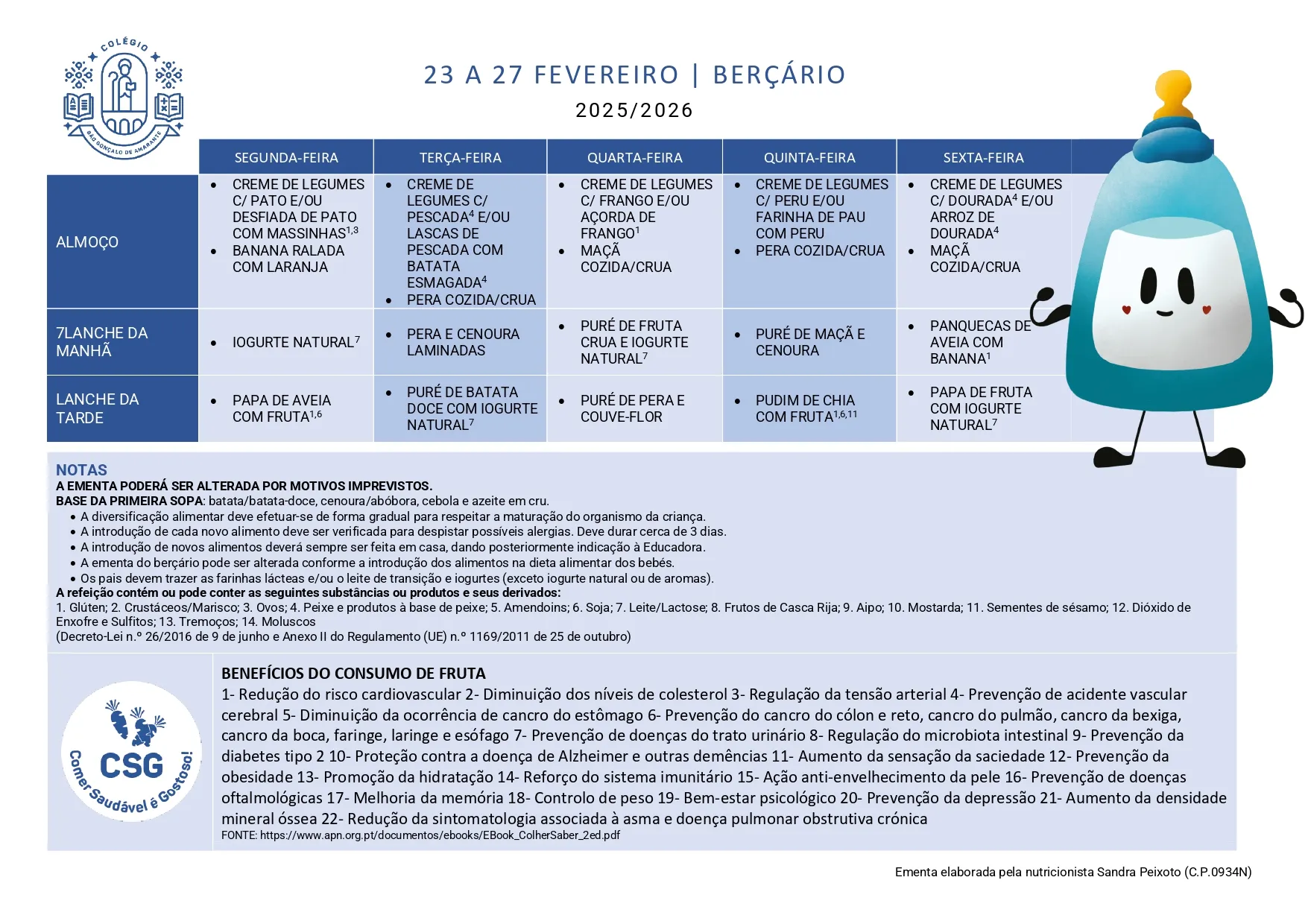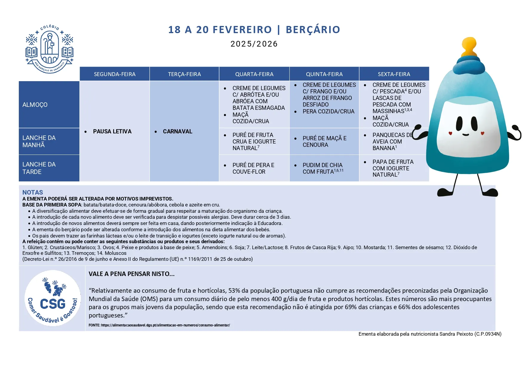 Ementa Home> Ementas> Ementa 09 - 13 fev 2026 Berçário 1 a 2 Anos 3 a 5 Anos Ementa 23 - 27 fev 2026 Berçário 1 a 2 Anos 3 a 5 Anos